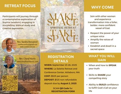 You are invited to Make Space – Take Space, a unique women’s retreat taking place September 23–26, 2025, at La Salette Retreat Center. Inspired by the daughters of Zelophehad—whose bold request changed history—this sacred time is designed to elevate women's voices and support each one in responding more deeply to God’s call. This retreat welcomes women of all faiths who are seeking space for rest, discernment, and renewal. If you’ve ever felt your voice silenced or sidelined, this gathering is for you. For more information or to register, visit: https://tinyurl.com/5bu2vj7p